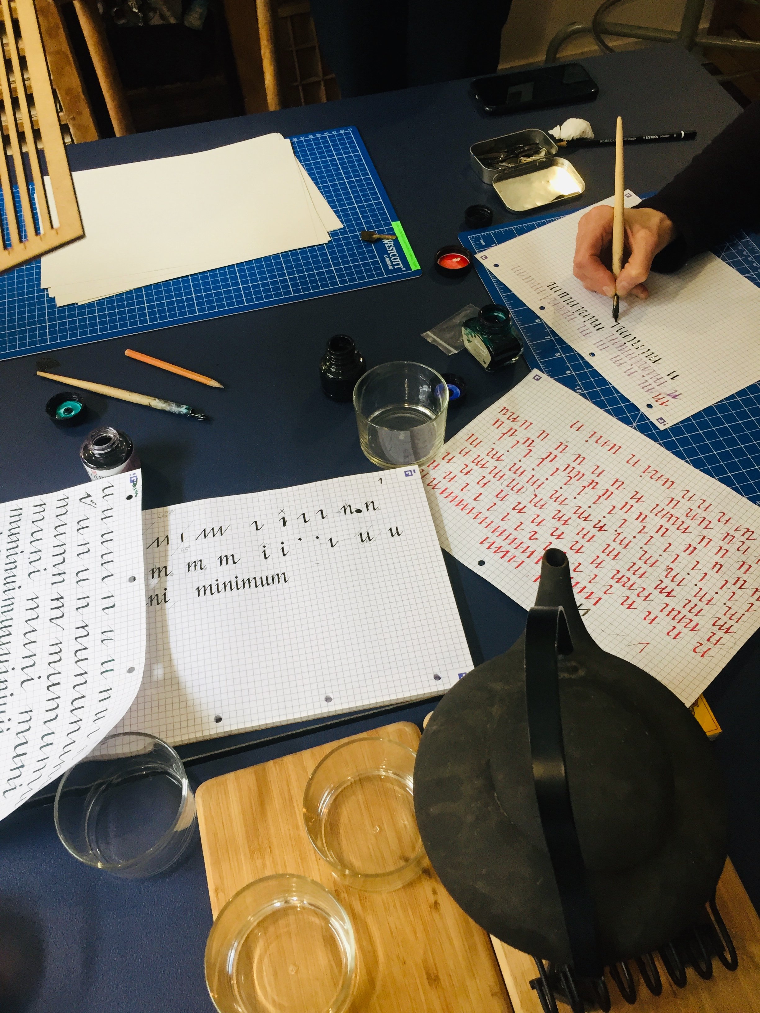 Dans cet atelier de prolongement, nous poursuivons le travail déjà entamé. Comme Caroline vous l’a déjà transmis : c’est en pratiquant que l’on progresse. Nous prenons le temps et approfondissons progressivement l’écriture de chancellerie. Pas à pas, nous complétons l’alphabet, en portant une attention constante aux formes, à la cohérence et à l’identité propre de chaque lettre.