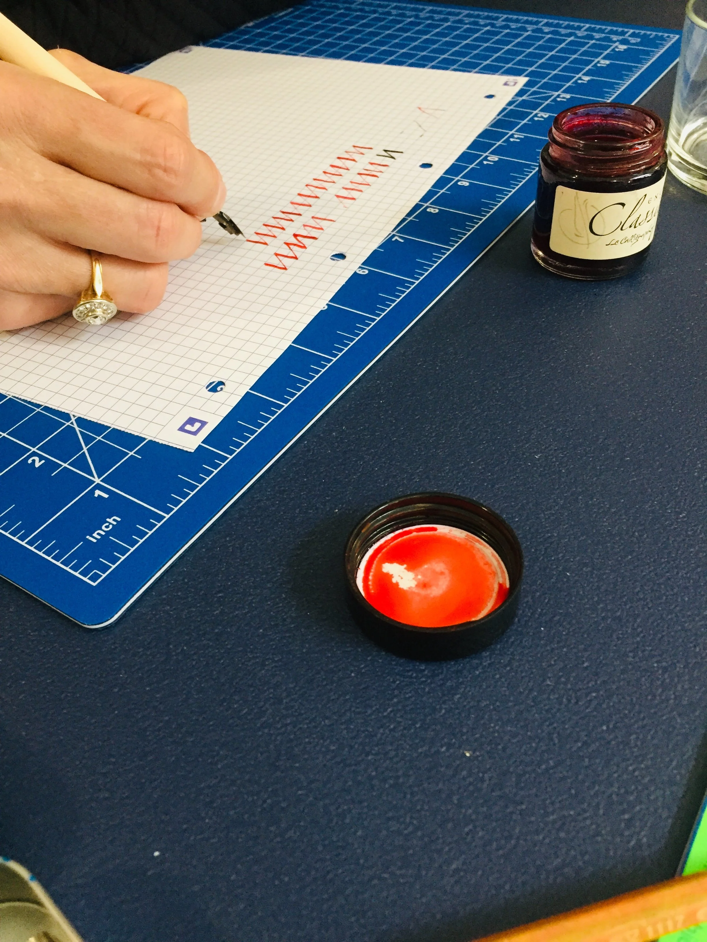 Dans cet atelier de prolongement, nous poursuivons le travail déjà entamé. Comme Caroline vous l’a déjà transmis : c’est en pratiquant que l’on progresse. Nous prenons le temps et approfondissons progressivement l’écriture de chancellerie. Pas à pas, nous complétons l’alphabet, en portant une attention constante aux formes, à la cohérence et à l’identité propre de chaque lettre.